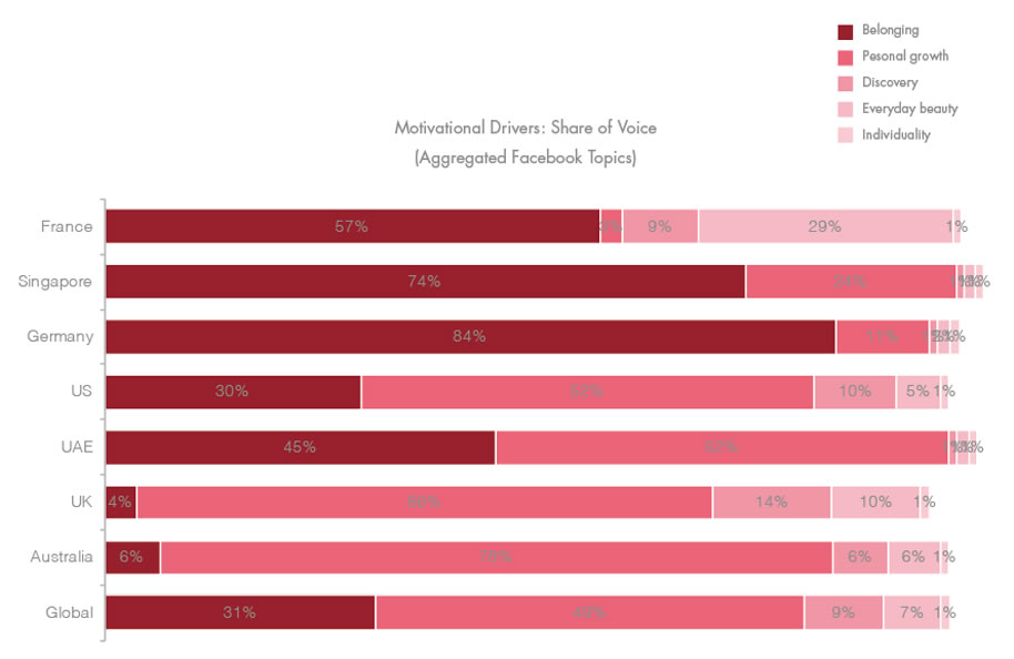 各地區(qū)話題占比一覽,由深至淺分別是歸屬感、個(gè)人成長、探索發(fā)現(xiàn)、美容健體、個(gè)性與獨(dú)立,從上至下是法國、新加坡、德國、美國、阿聯(lián)酋、英國、澳大利亞及全球
