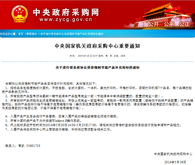 中央國家機關政府采購中心近日發出一份通知。通知要求,國家機關進行信息類協議供貨強制節能產品采購時,所有計算機類產品不允許安裝Windows8操作系統。 -
