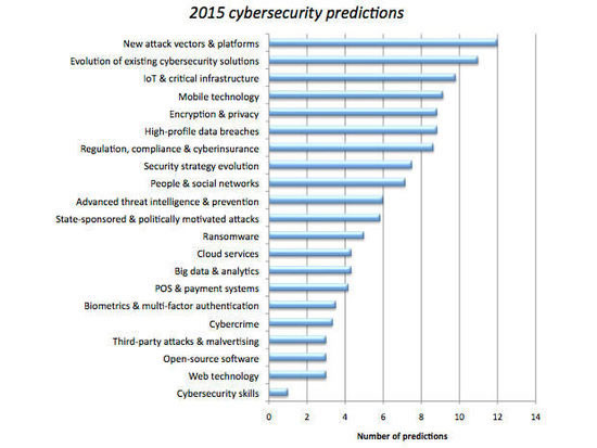 好幾個預測類型都指出了特定的新攻擊類型和平臺,尤其是物聯網、移動科技、社交網絡、大數據和分析、云服務、零售終端和支付系統、網絡技術、開源軟件、第三方攻擊和惡意廣告。這顯示了隨著整個世界通過網絡相連,黑客攻擊的機會越來越多,例如近期發現的一個弱點使得通過基于Linux的控制軟件就可以劫持無人機(或者無人駕駛飛行器)。